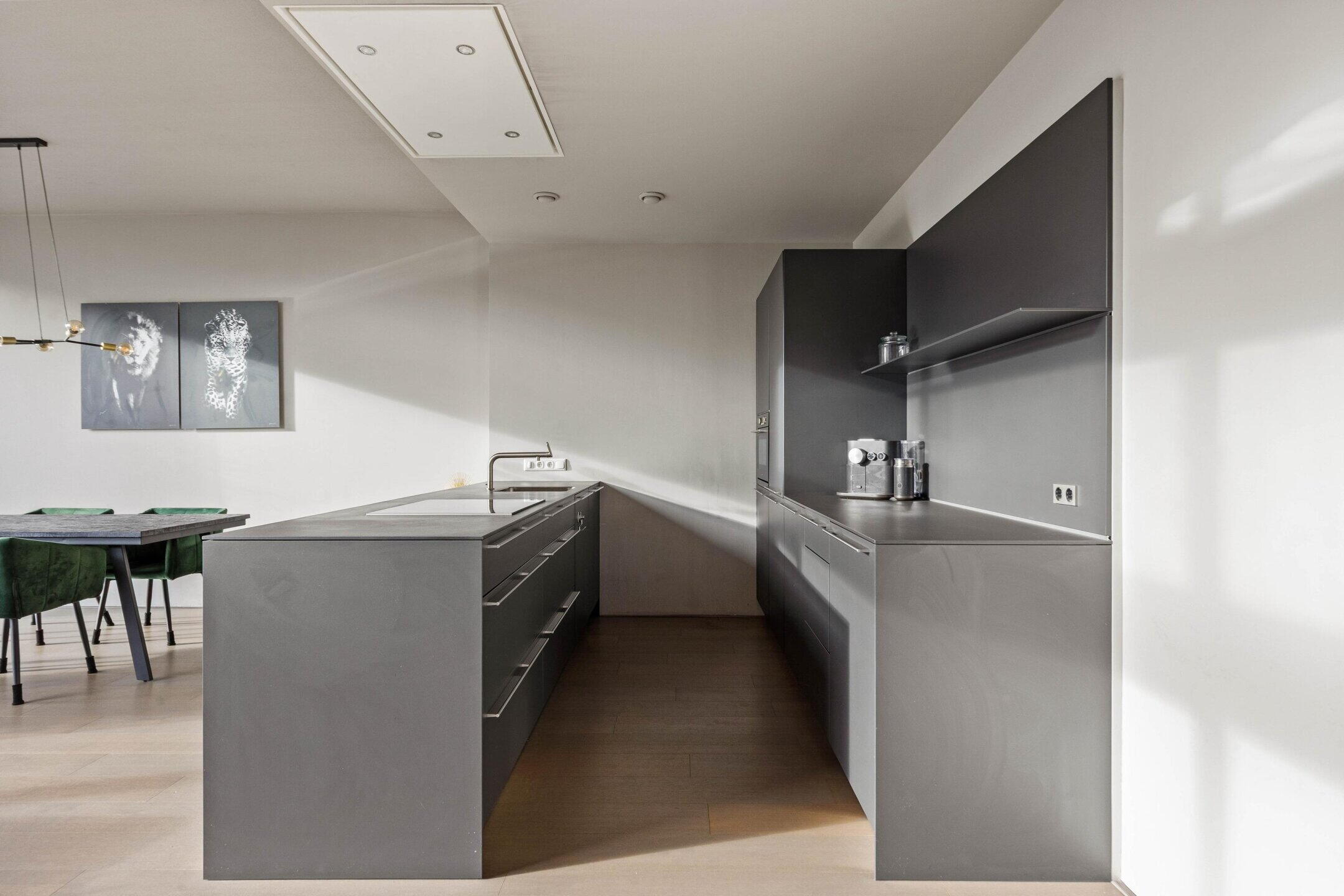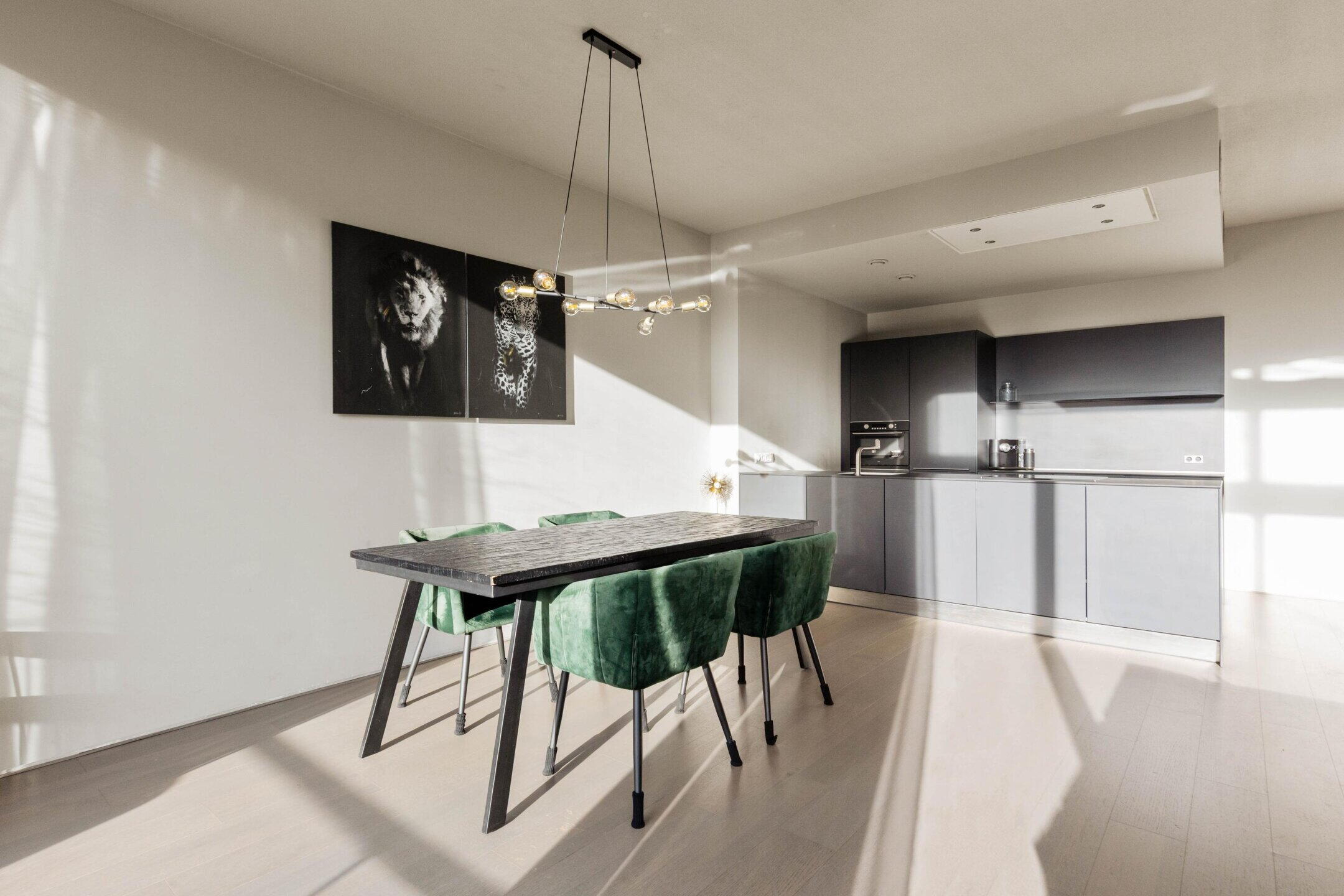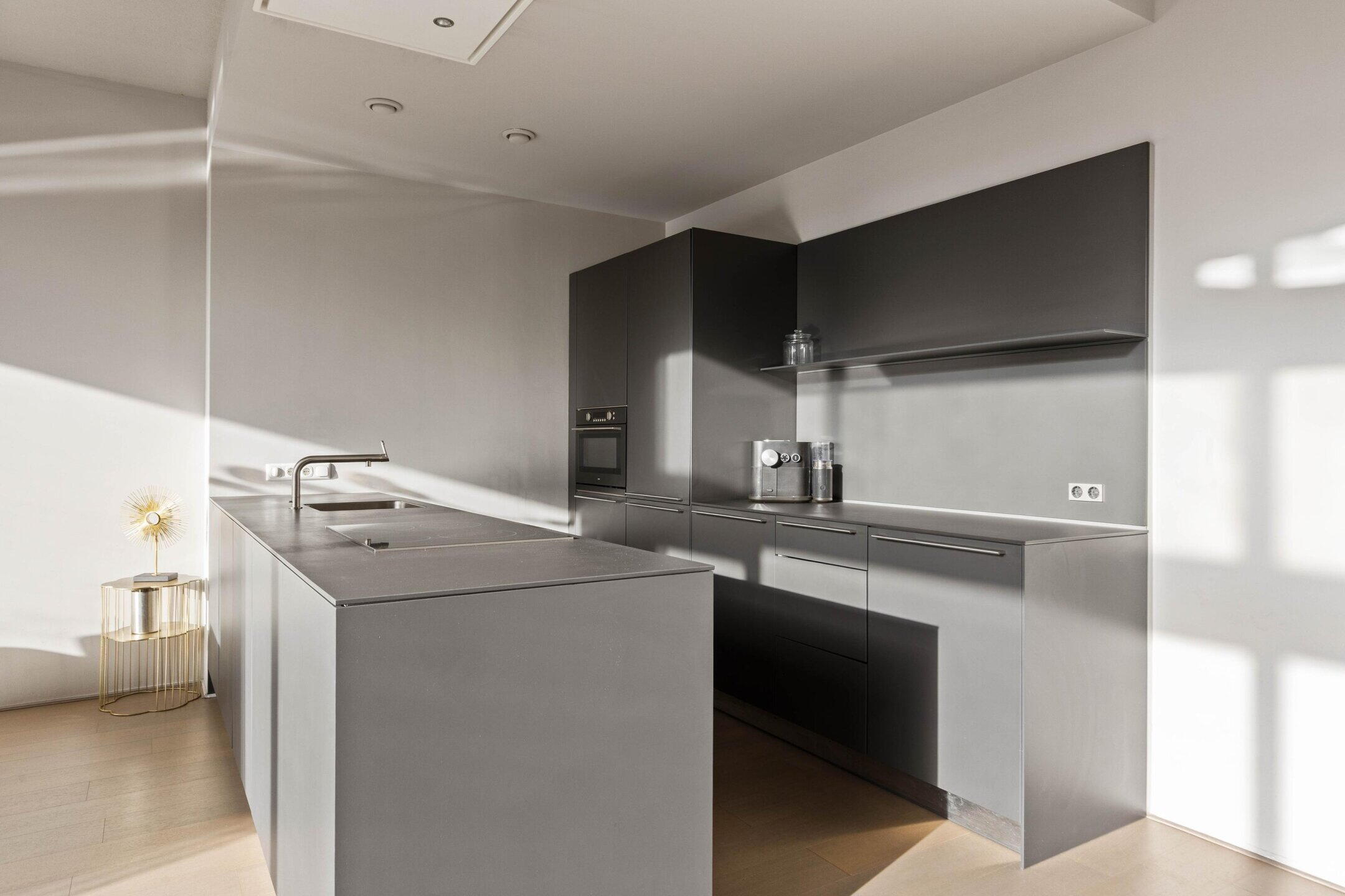 The kitchen is modern and sleek, has a sink/cooking island, and is of course equipped with various built-in appliances. The number of square meters here allows for the placement of a good dining table to create a cozy dining area.