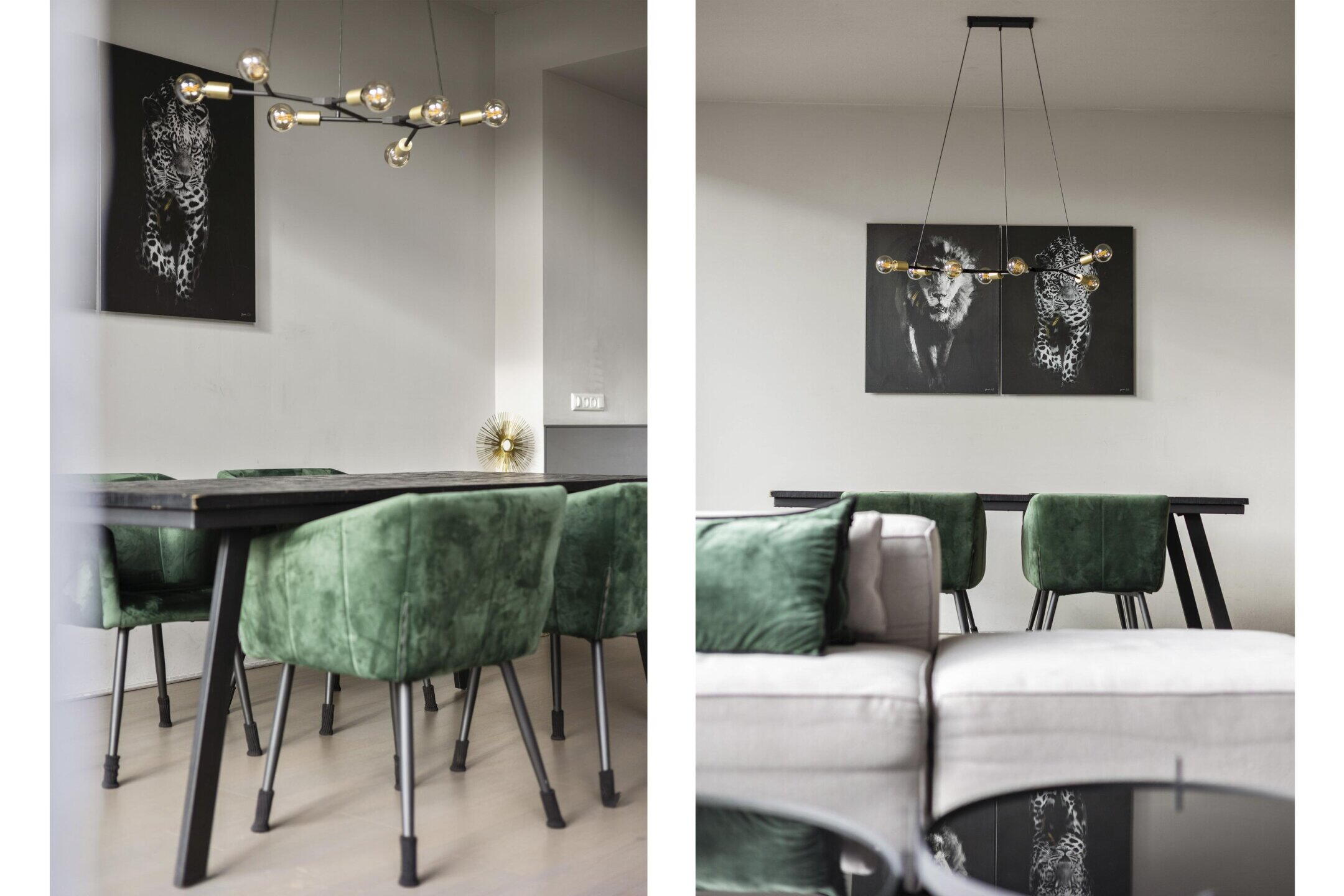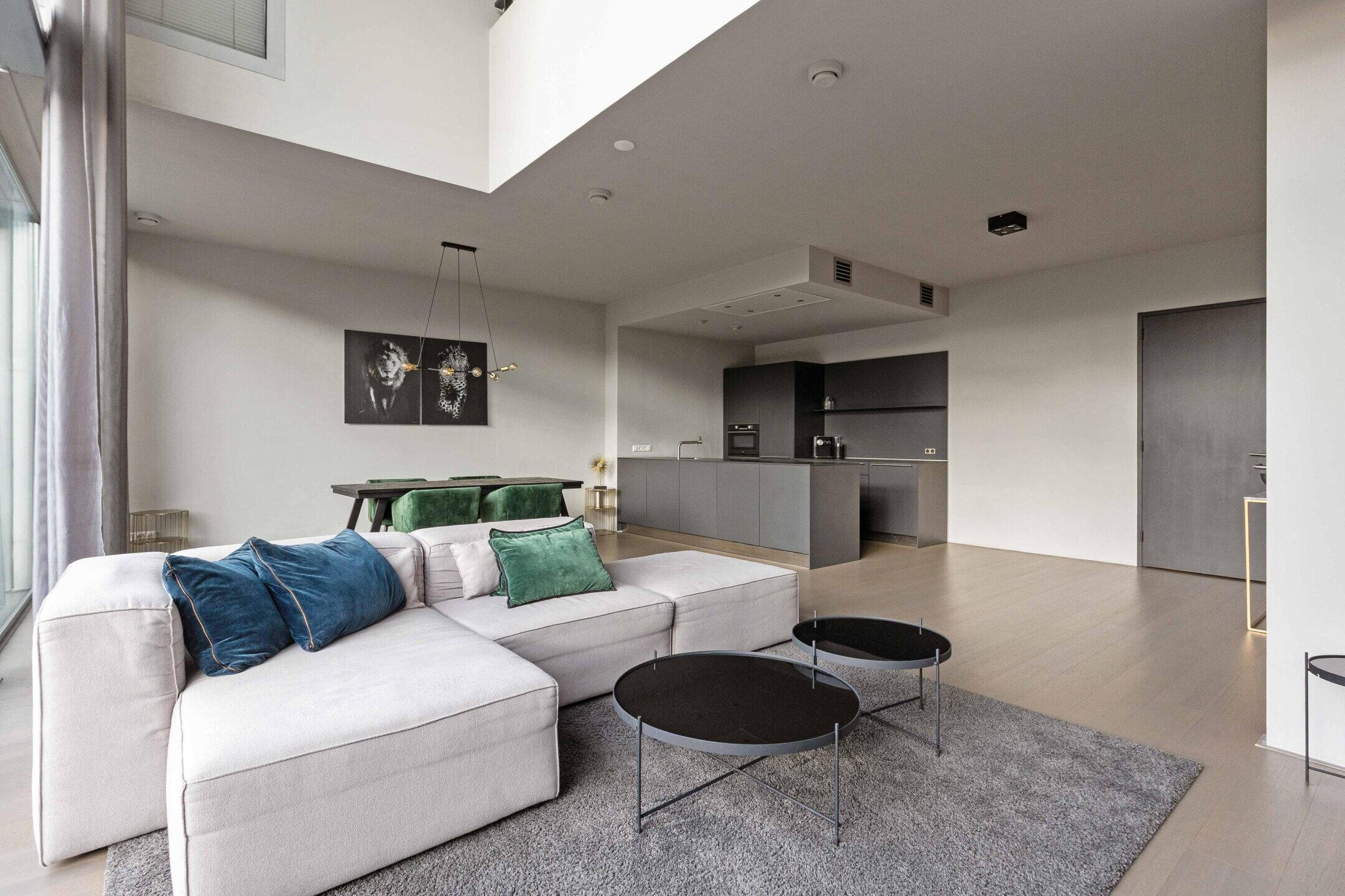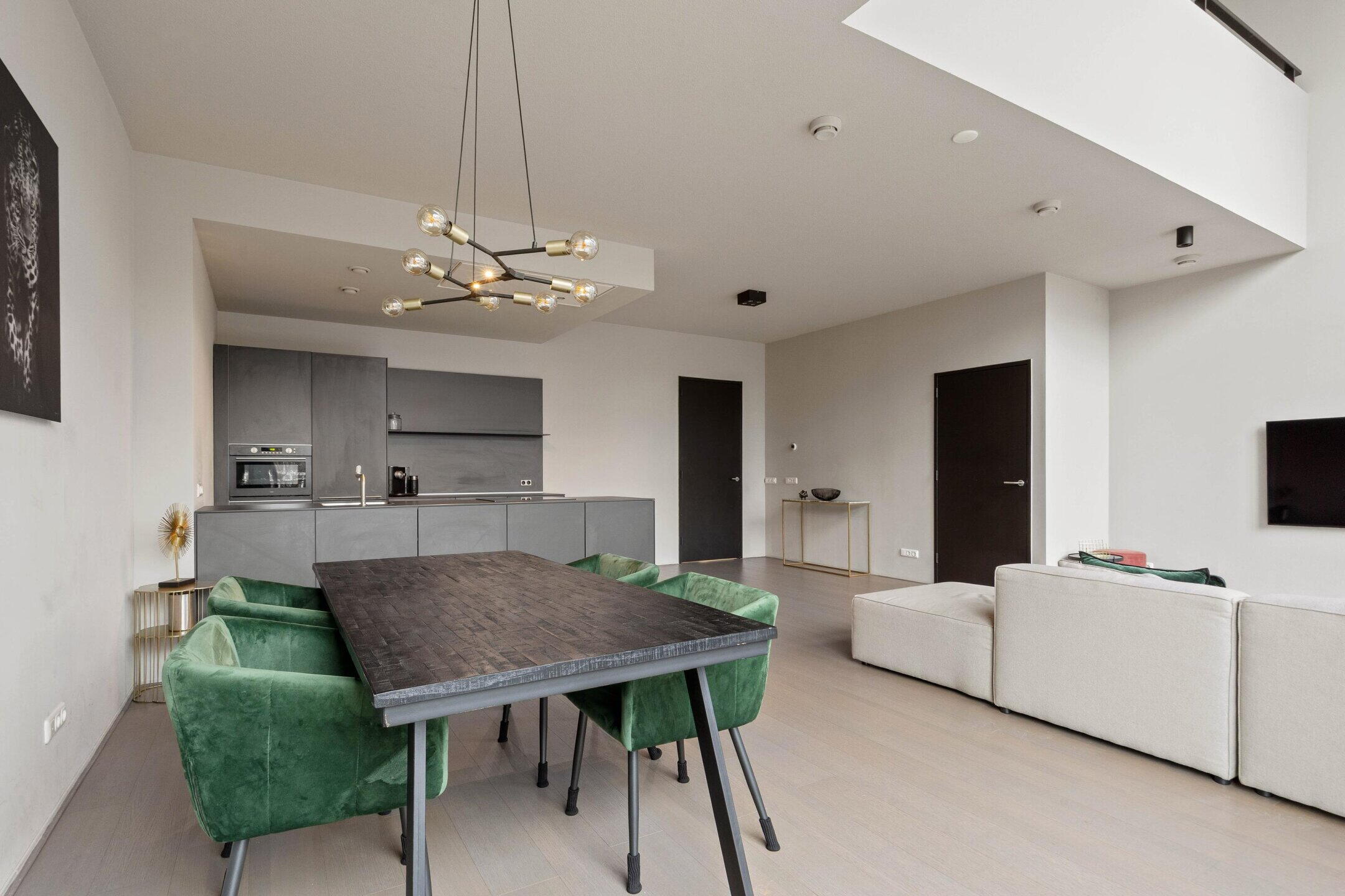 The kitchen is modern and sleek, has a sink/cooking island, and is of course equipped with various built-in appliances. The number of square meters here allows for the placement of a good dining table to create a cozy dining area.