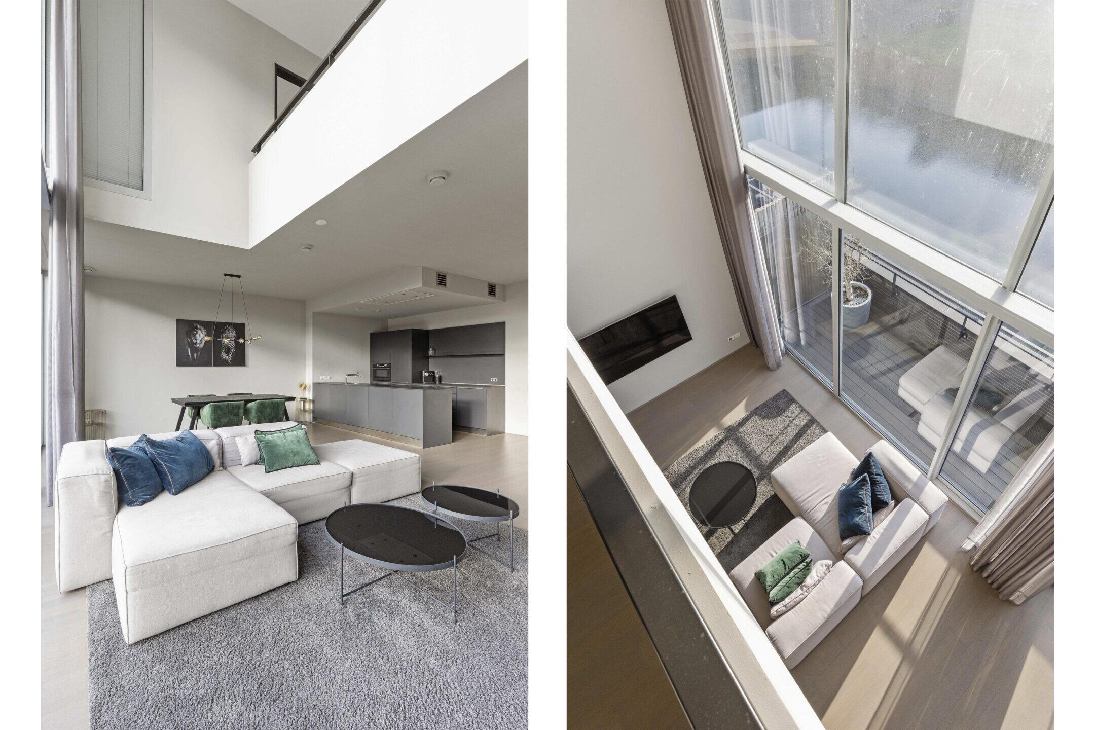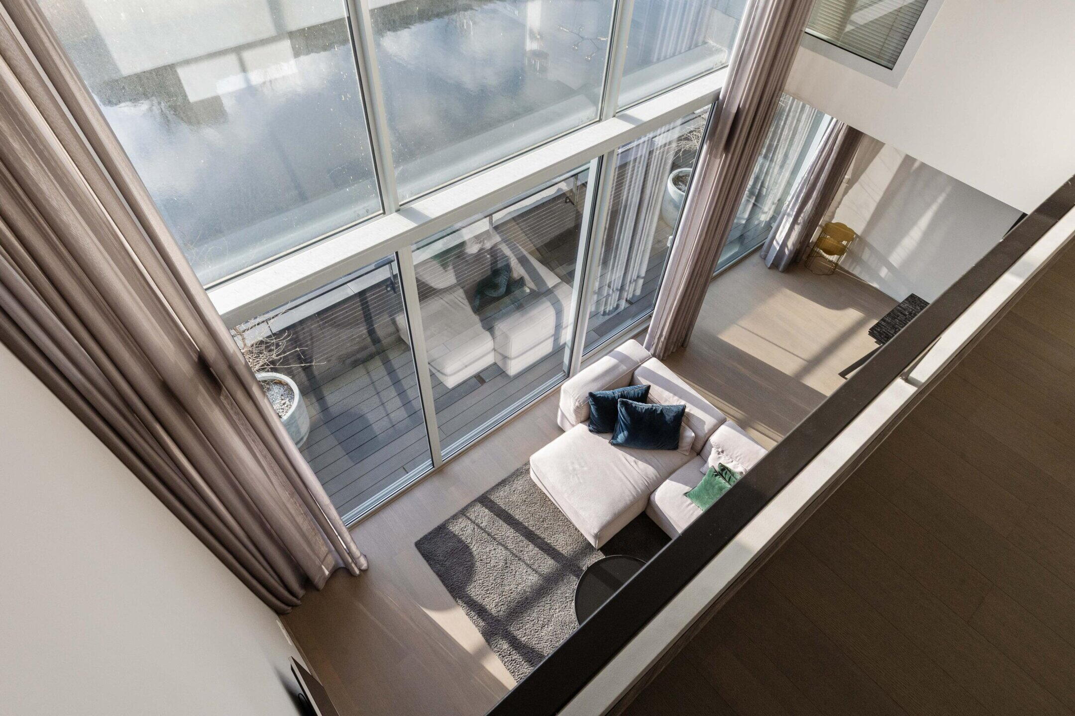 The ground floor features a spacious living area: a large living room and a large kitchen. The impressive full-width glass front provides plenty of daylight and direct contact with the outside. Sliding doors lead to the sunny balcony with a view over the water.