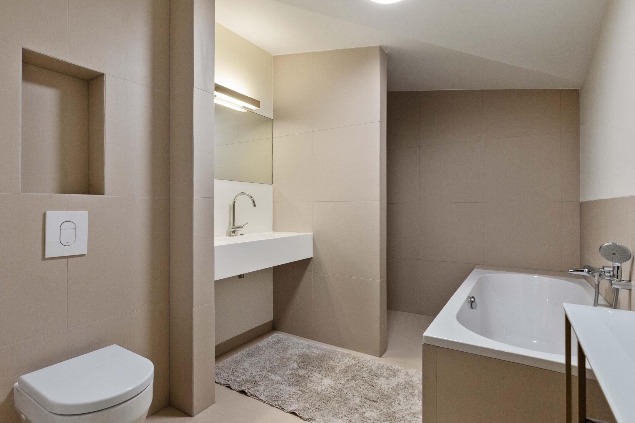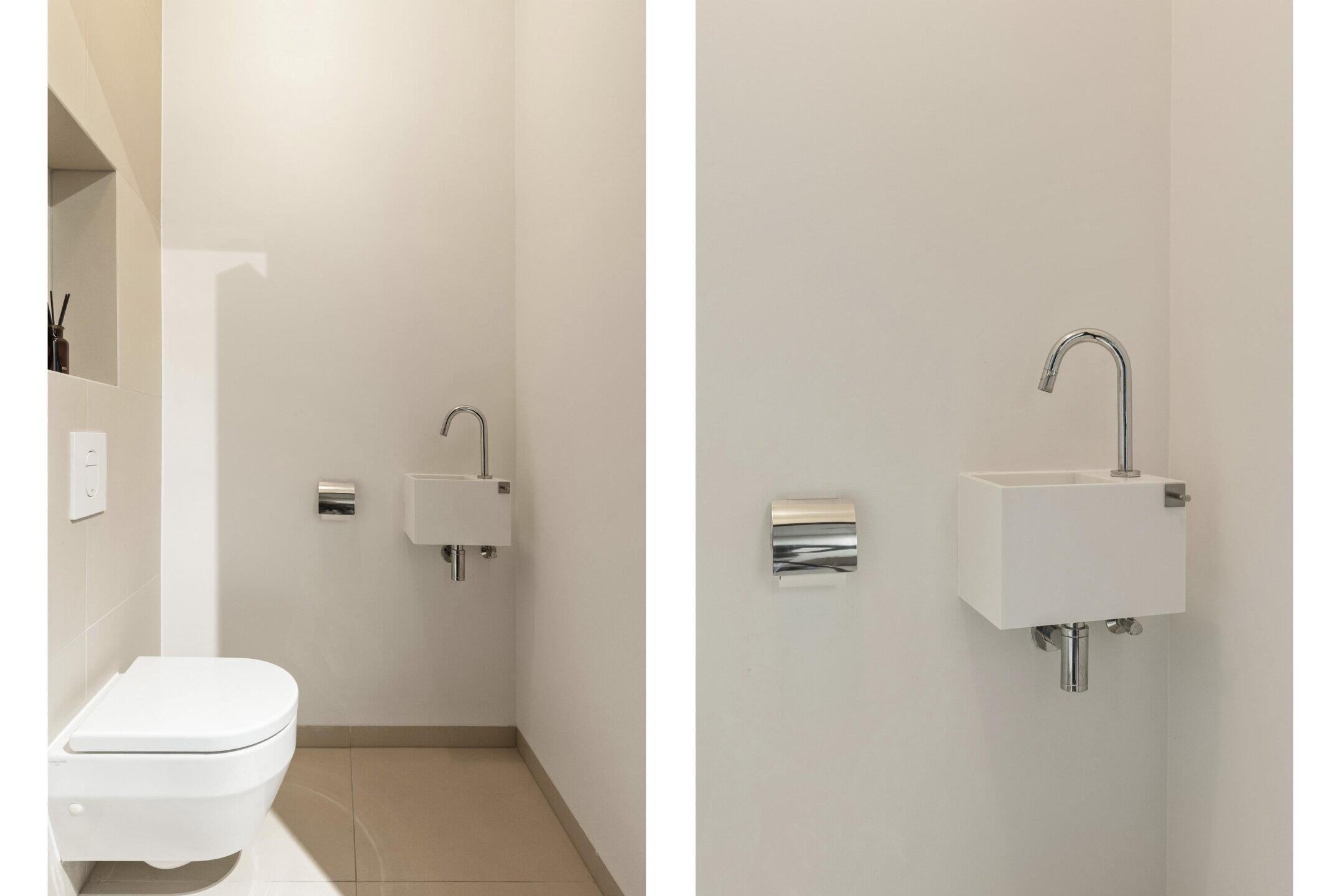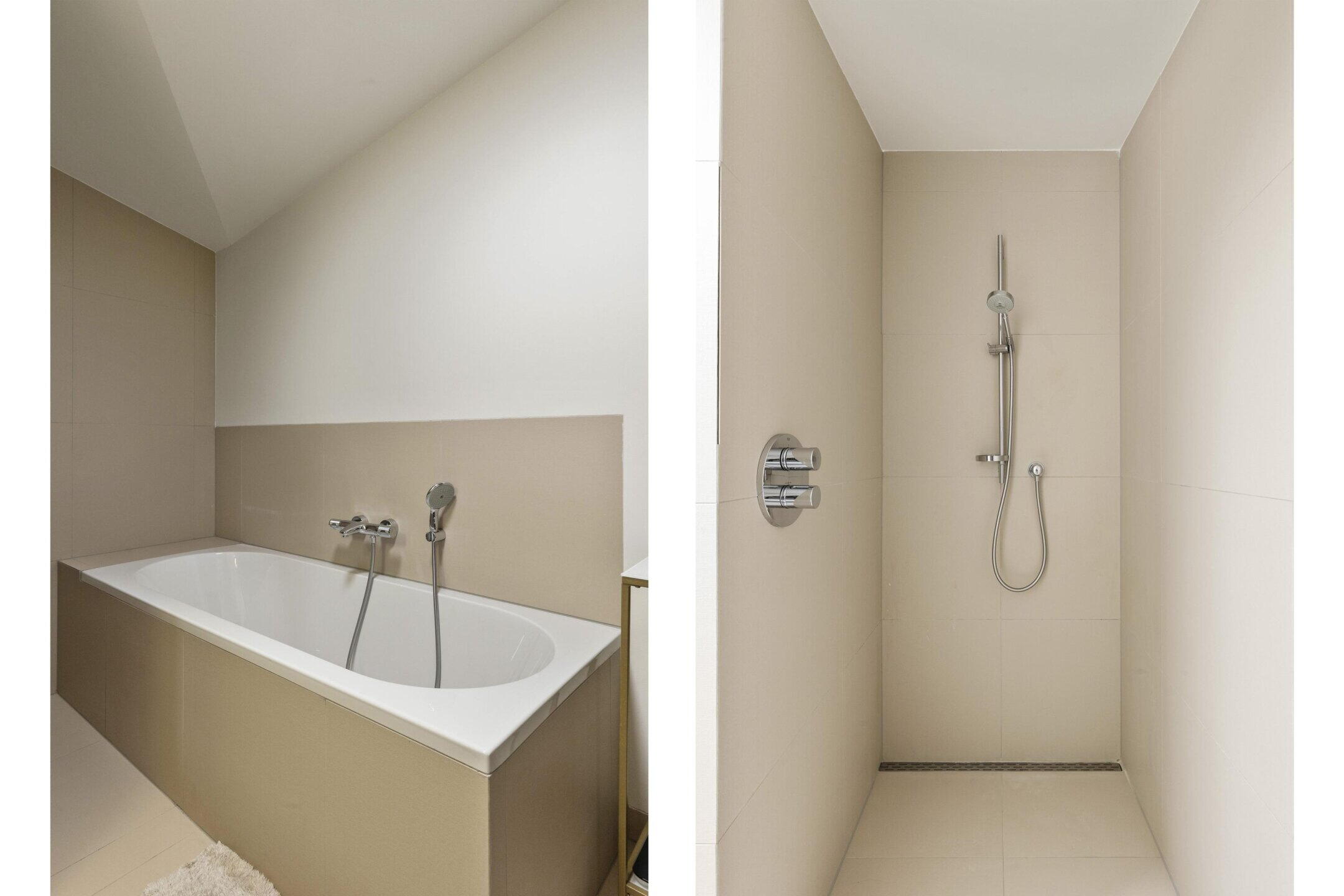 The luxurious bathroom is fully equipped with a bathtub, walk-in shower, second toilet, and double sink. There is also a separate indoor space for a washing machine, dryer, heat pump, and extra storage space.